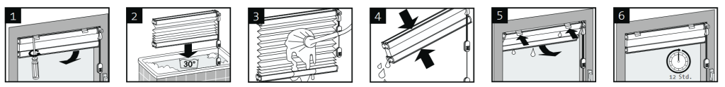 Während des Trocknungsprozesses sollten Sie das Plissee mehrmals öffnen und schließen, um ein Verkleben der Falten zu verhindern. Bügeln ist nicht empfohlen. Bei elektrischen und kurbelbetriebenen Anlagen ist es wichtig, dass die mechanischen Teile nicht mit Wasser oder Waschmittel in Kontakt kommen.