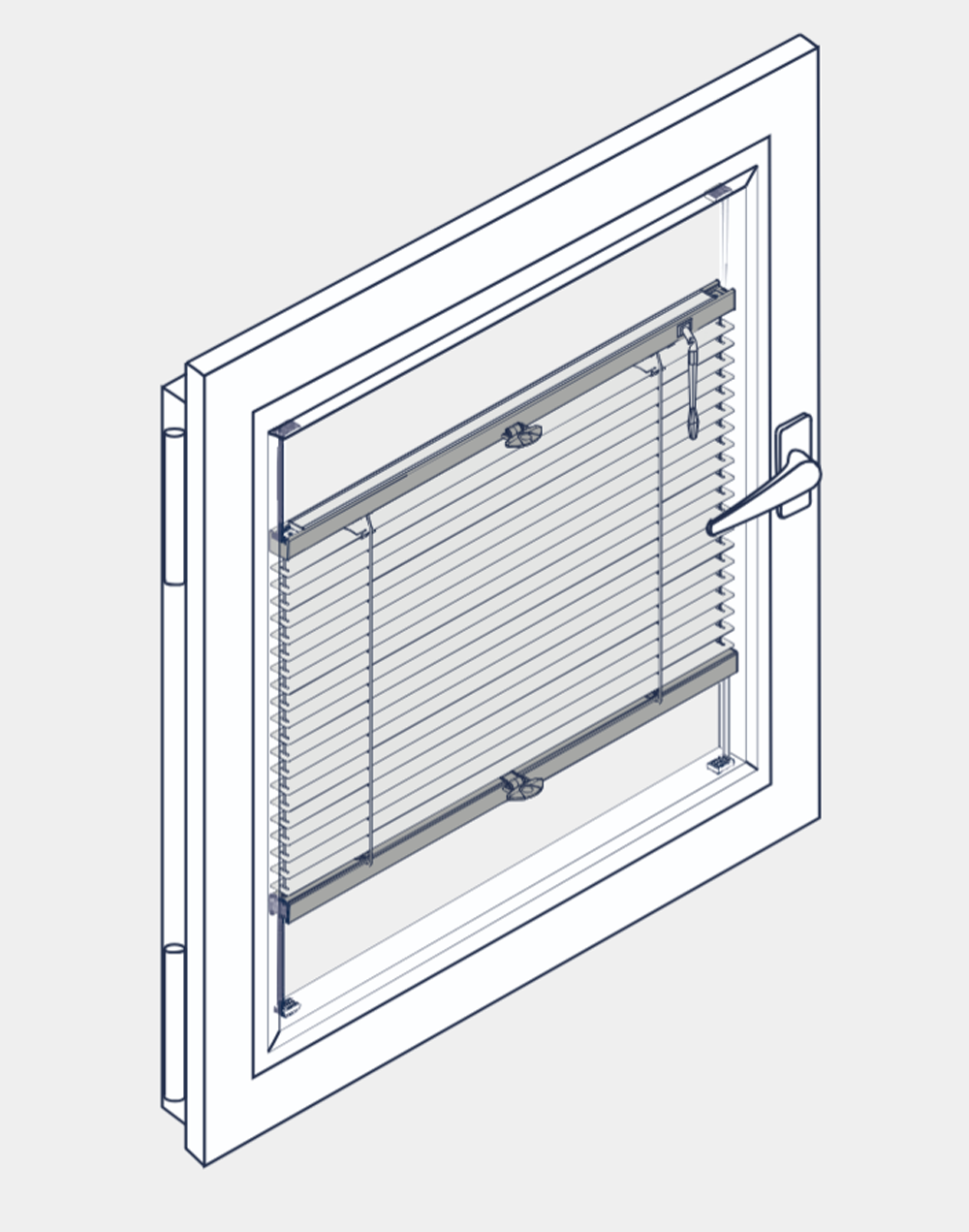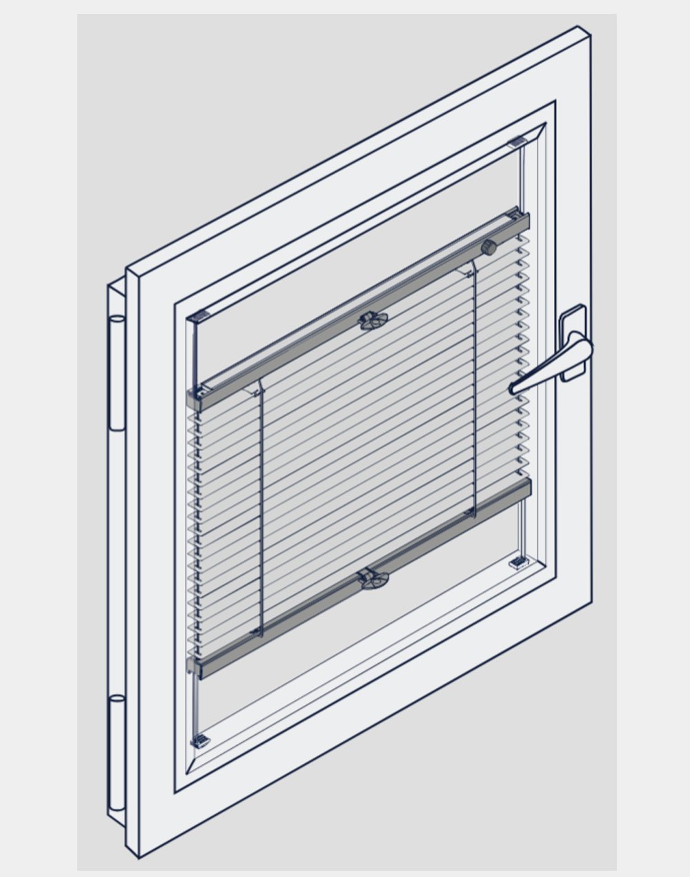 Lamellenwendung mittels Drehknopf (in weiß oder grau) oder Bedienstab (Schneckengetriebe + Plexi-Drehstab).